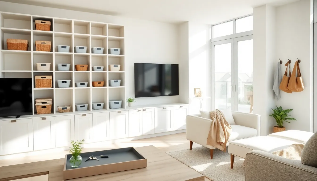 Living room storage often hides in plain sight. Ottomans with interior storage hold blankets and pillows. Coffee tables with shelves or drawers organize remotes, coasters, and magazines. Decorative baskets blend with décor while containing toys, throws, or gaming accessories.